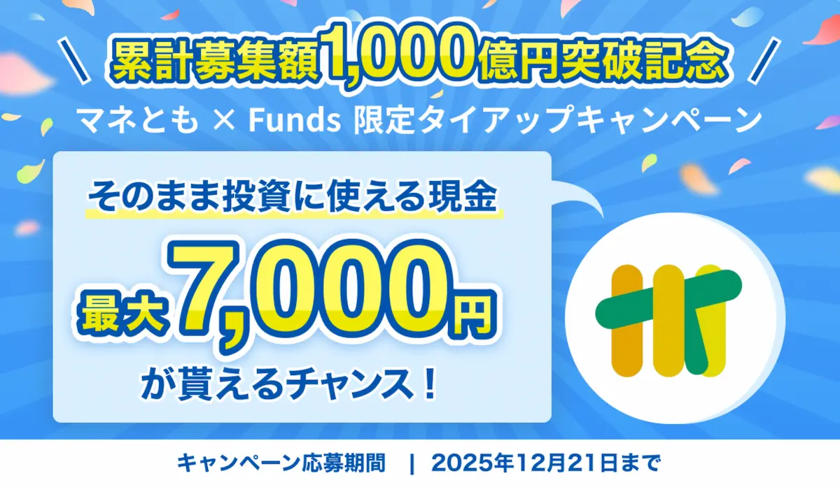 1. 口座開設だけで2,000円+投資で最大5000円プレゼント「マネとも×Funds限定タイアップキャンペーン」(2025年12月21日まで)