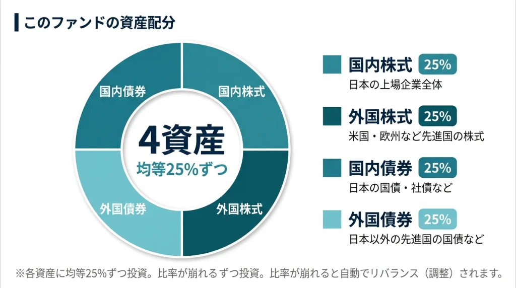 そのGPIFが2025年以降の運用方針として採用している資産の配分が、「国内株式25%・外国株式25%・国内債券25%・外国債券25%」——このファンドとまったく同じ比率です。