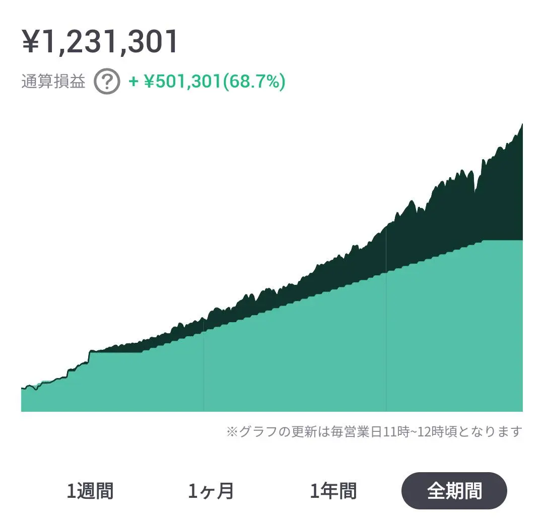 私はROBOPROのサービス開始から積立投資をしていますが、実際は積立投資をしていた場合より、一括投資をした方が運用実績は好調でした。